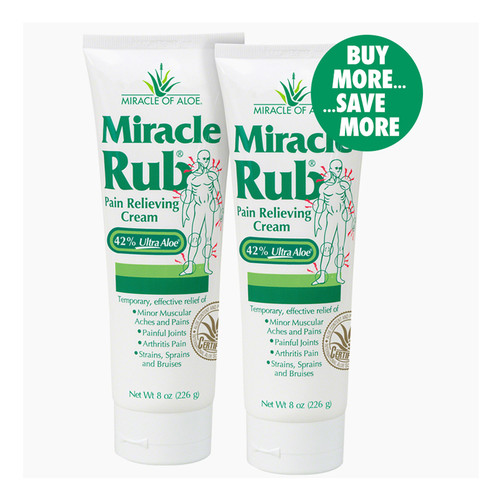 MILLIONS HAVE DISCOVERED FAST, EFFECTIVE RELIEF FROM JOINT AND MUSCLE PAIN with Miracle Rub Pain Relieving cream. Discover for yourself the blessed relief from pain a simple application of this wonderful cream can bring you. If you are one of the people who suffer daily from the agonizing pain caused by Arthritis, Bursitis, Rheumatism, back, leg, ankle or arm pain, or sore, stiff muscles, Miracle Rub is for you. This unique pain relieving formula combines the super penetrating power of 42% pure organic UltraAloe gel with clinically proven pain relievers to bring you fast, effective relief from the nagging pain, discomfort and inflammation you have been living with. Just apply this soothing rub and you will be amazed how quickly it penetrates to relieve pain, soreness, aches and stiffness. You’ll enjoy life more knowing every day can be pain free with a quick application of soothing Miracle Rub. Great for strains, sprains and bruises too! Available in 4 oz, 8 oz, 32 oz with pump and 1 oz travel sizes.